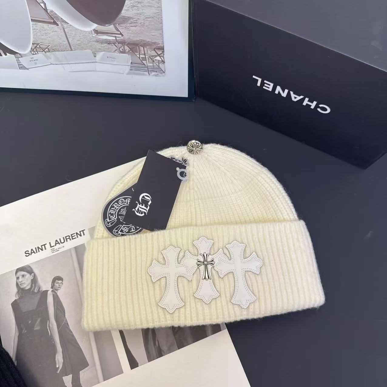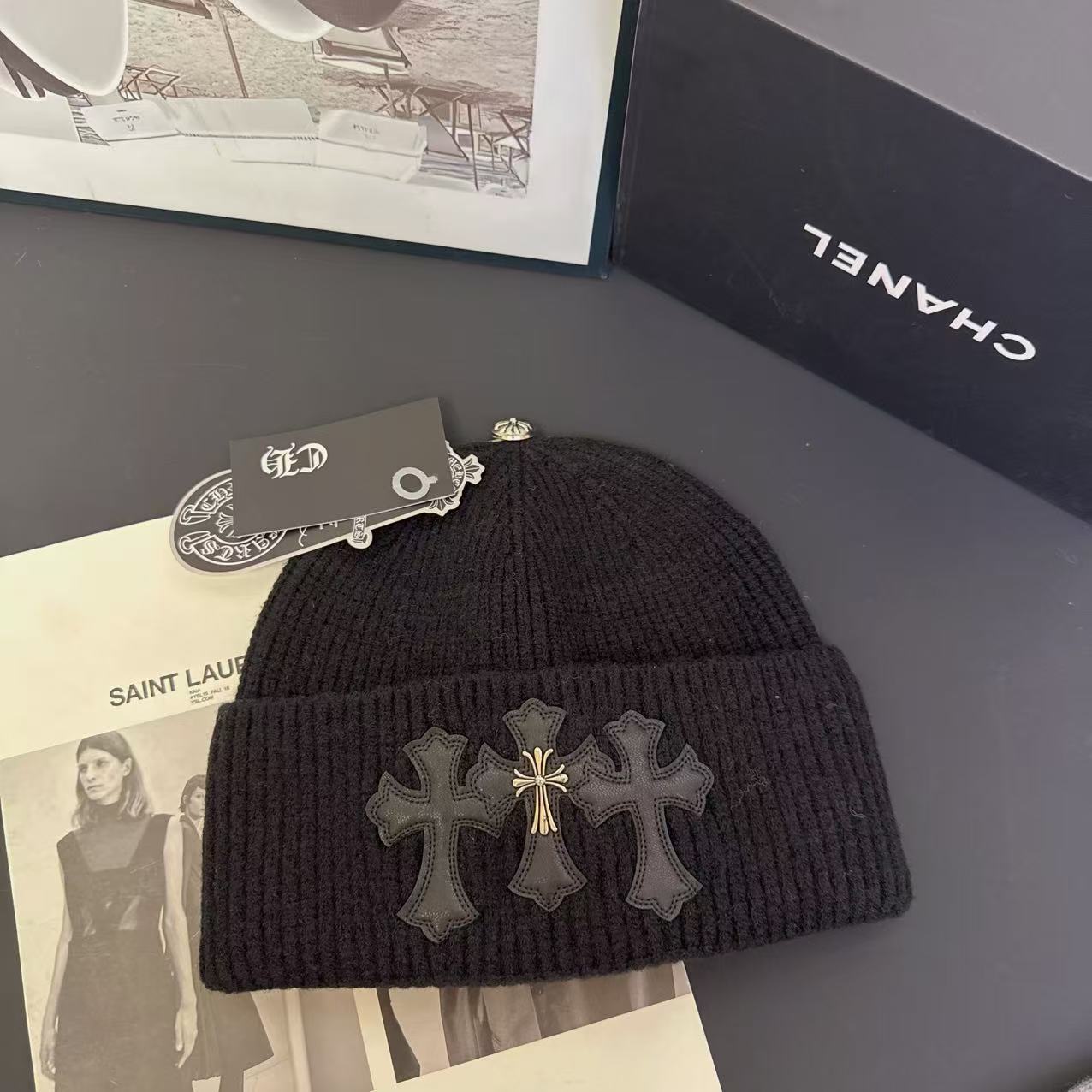 Das zentrale Design-Element sind drei markante Kreuz-Applikationen auf der Vorderseite der Mütze. Diese Symbolik stammt aus der klassischen Gothic- und Rock-Fashion und wird seit Jahrzehnten als Zeichen für Individualität, Rebellion und spirituelle Symbolik getragen.