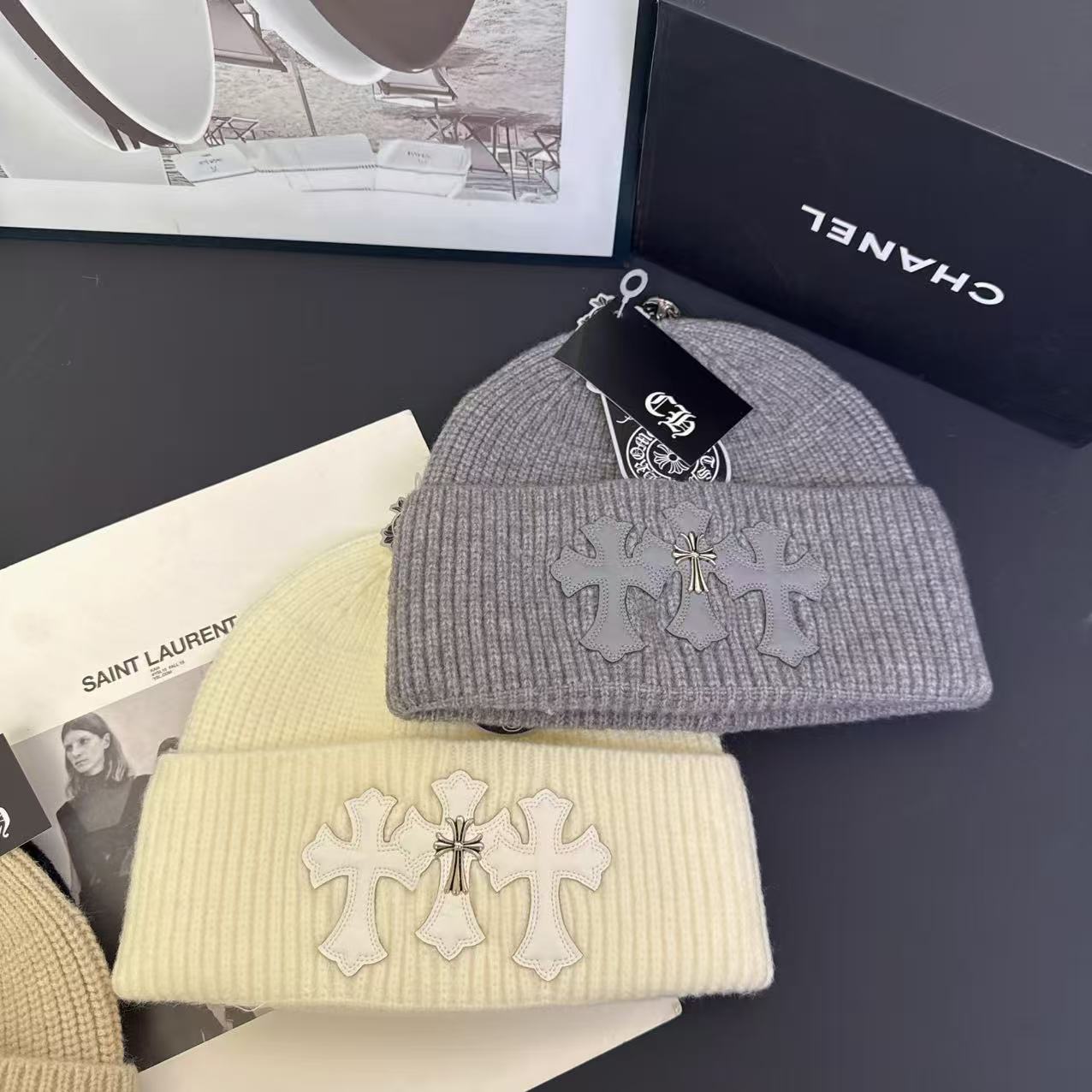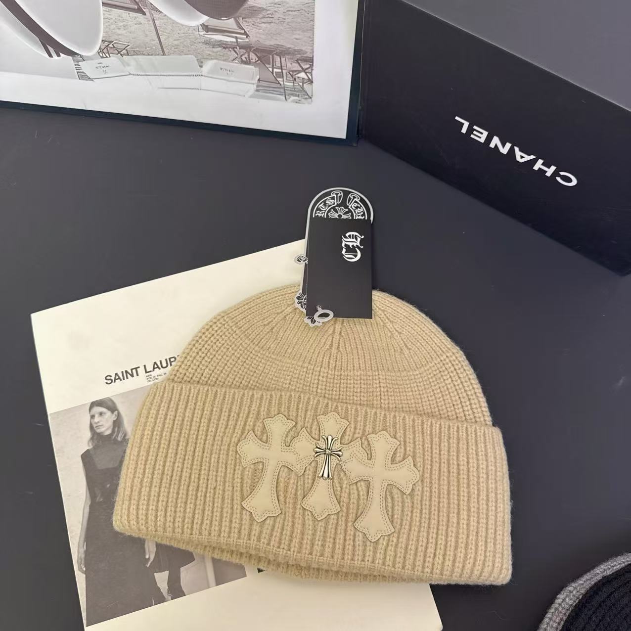 Die Kreuze sind bewusst minimalistisch gehalten und wirken wie kleine Metall-Embleme auf dem gestrickten Stoff. Dadurch entsteht ein starker Kontrast zwischen dem soften Strickmaterial und der kraftvollen Symbolik.